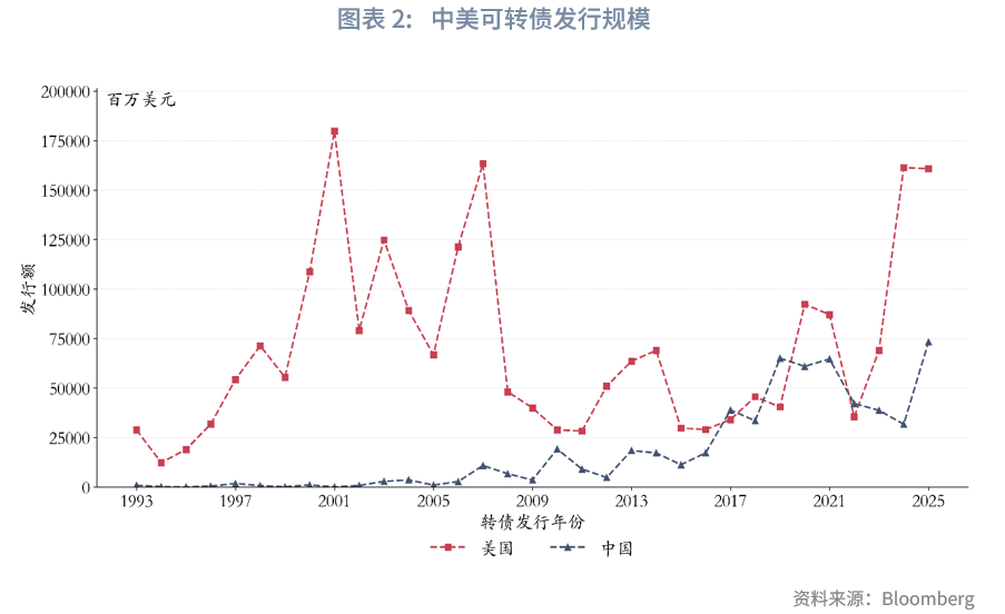 中国与以美国可转债市场在基础层面存在系统性差异。一是发展过程。美国可转债市场始于1843年,已进入高度成熟稳定阶段,而中国自1992年起步,2017年后才进入快速发展期,目前虽已成为全球第二大市场,但制度仍在完善之中。二是市场情况。中国市场发行可转债主要是为了最终转股,投资者以做多策略为主,美国市场发行可转债主要是为了更低的票息和延迟稀释股权,投资者以对冲策略为主。三是条款差异。中国可转债普遍设有向下修正转股价条款,不同转债的条款较为一致,而国际市场下修条款非常少,并且存在很多个性化的灵活条款。