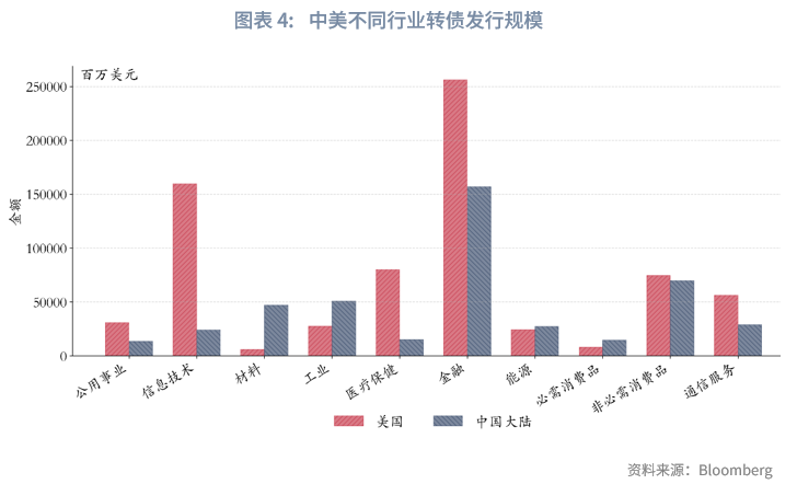 在发行的行业分类方面,根据彭博1级行业分类,中国目前以金融、非必需品消费、工业和材料为主,美国除了金融和非必需品消费行业和中国类似,信息技术和医疗行业发行转债的规模居前,这些新兴行业融资需求强且适合用可转债支付对价。由于近年来沪深交易所优化再融资的措施,可转债发行收紧,目前中国的转债发行也更多面向新兴科技行业,支持新兴科技行业通过发行转债进行再融资。