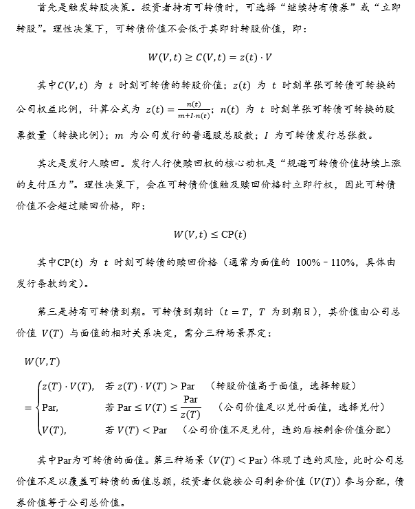 Ingersoll(1977)以及Brennan 和 Schwartz (1977,1980)提出基于公司价值的估值模型,该估值模型扩展了B-S期权估值思想在可转债估值的应用逻辑。原始 B-S 公式是为欧式看涨期权估值设计的经典模型,其适用场景具有“单一权利、无信用风险、固定合约条款”等明确前提。而可转债作为“债券 + 期权”的混合金融工具,具备一系列复杂特性,导致其与 B-S 公式的适用条件存在本质差异。但是其估值模型的构建仍以 B-S 框架下的连续时间无套利偏微分方程为核心,通过设计针对性的边界条件,精准刻画可转债的特殊结构与条款特征,最终实现对其价值的测算。