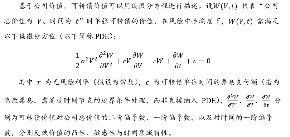 该 PDE 与原始 B-S 期权估值 PDE 的核心结构一致,差异主要体现在两点:一是将状态变量从股价S替换为公司总价值V;二是增加了票息项c,以反映可转债的债券属性。