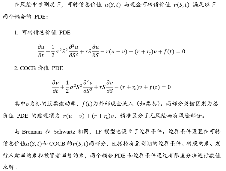 TF模型将可转债总价值u(S,t)拆分为两个组成部分。一部分是与股票转换权利相关的权益成分,其价值取决于正股价格,不依赖发行人信用履约,因此无信用风险,应使用无风险利率贴现。另一部分是现金可转债成分,代表未来票息、本金及回售款等现金流入的现值,其偿付依赖于发行人的信用状况,具有信用风险,需使用无风险利率加上信用风险溢价进行贴现。尽管可转债整体价格可简化为一个函数表达式,但TF模型认为在精确估值中必须分别处理这两部分,以准确反映其混合属性——既包含无风险的期权价值,也包含受信用风险影响的债券现金流。