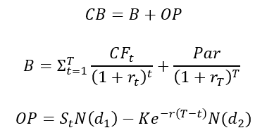 早期对可转债的估值,主要思路是对可转债价值进行刻画,经典模型将可转债看作普通公司债券和股票期权的组合,那么可转债价格可以表示为: