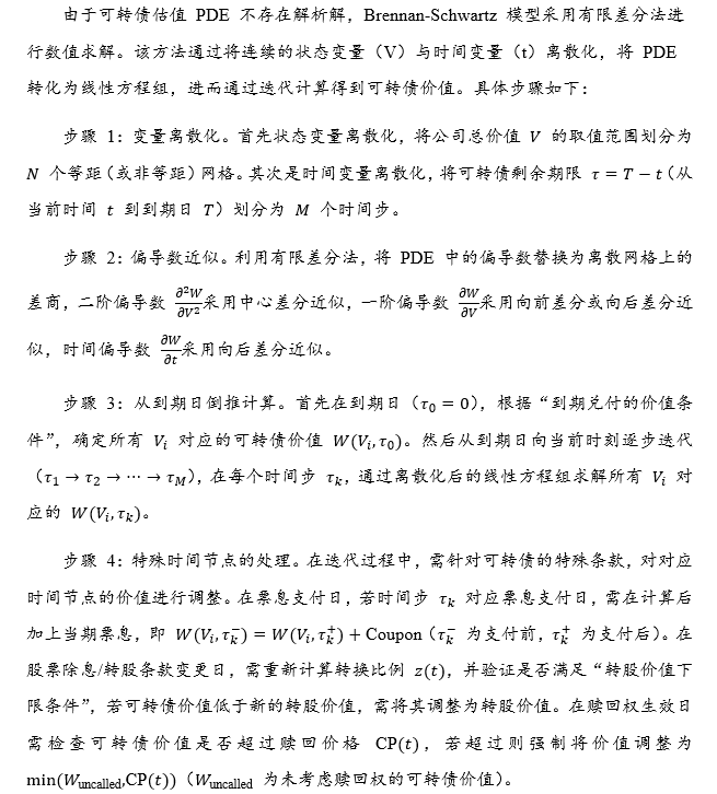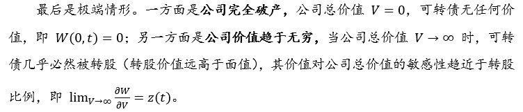 该 PDE 与原始 B-S 期权估值 PDE 的核心结构一致,差异主要体现在两点:一是将状态变量从股价S替换为公司总价值V;二是增加了票息项c,以反映可转债的债券属性。